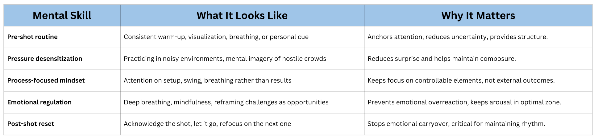 3. Create a reliable pre-shot routine - Warm-up consistently, use a cue, or follow a sequence that anchors your mind. Predictability reduces anxiety.